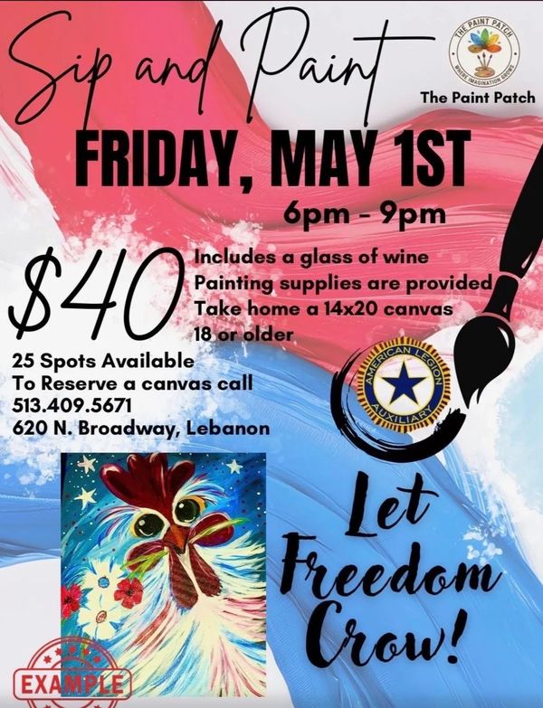 Join us for a fun and patriotic Sip & Paint: Let Freedom Crow event! Enjoy a relaxing evening with friends as you create your own bold, Americana-inspired painting—no experience needed. Sip a glass of wine, unwind, and let your creativity soar while supporting a great cause. All supplies are provided, so just bring your spirit and get ready for a memorable night of art, laughter, and community! 18 or older, 21 Drinking Age.